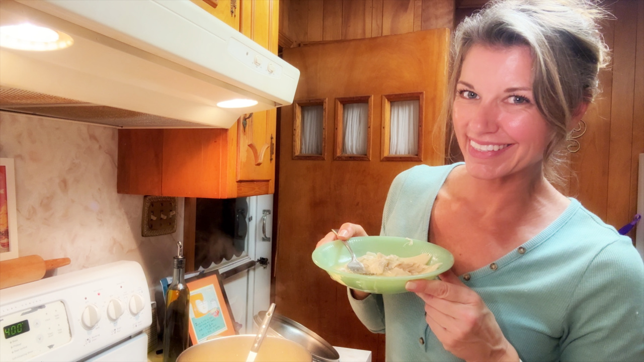 2. Skim fat off top of broth. Add water to broth to equal 4 quarts of liquid. Bring back to a boil.